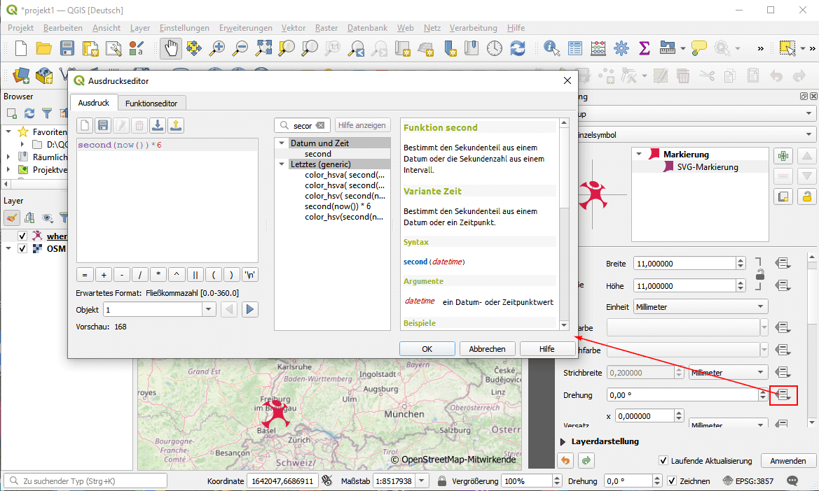 Die Drehung erreichen wir durch eine datendefinierte Übersteuerung der Drehungseigenschaft des Symbols. Hierzu klicken wir auf das kleine Viereck neben dem Drehwert und wählen Bearbeiten aus. Im Ausdruckseditor verwenden wir die Funktion: second(now()) * 6