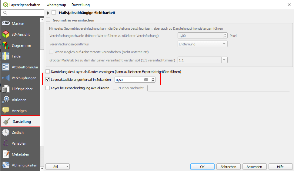 Hierzu gehen wir in die Layereigenschaften (Doppelklick oder rechte Maustaste->Eigenschaften...) und dort in den Reiter "Darstellung". Hier können wir das Layeraktualisierungsintervall aktivieren und setzen es auf 0,5 Sekunden. Anschließend sollte sich unser Logo bereits drehen.