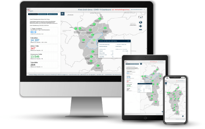 Das COVID-19 Dashboard (geoportal.kreisgg.de/application/TK_KGG_Covid_Dashboard) bietet eine Übersicht über Fallzahlen, aktive Fälle, Zahl der Genesenen und Todesfälle aus allen 14 Kommunen des Kreises und zeigt die 7-Tage-Inzidenz für das gesamte Kreisgebiet an.