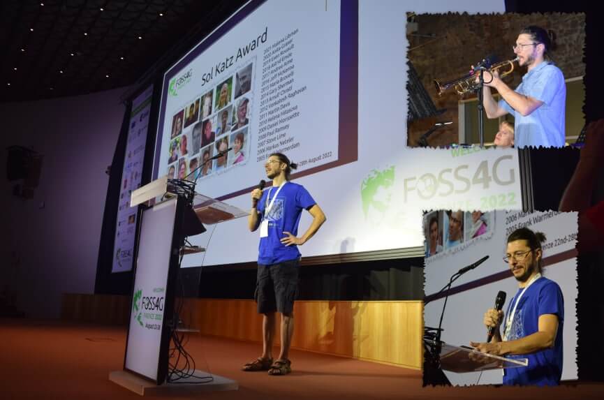 Der Sol Katz Award wurde 2022 zum 18. Mal verliehen. Die Auszeichnung wird jedes Jahr auf der FOSS4G an eine Person vergeben, die sich durch besonderes Engagement für die Open-Source-Geospatial-Community ausgezeichnet hat. In diesem Jahr ging der Preis an den Italiener Sandro Santilli (strk), der seit vielen Jahren zu Projekten wie PostGIS, GEOS und QGIS beiträgt und die OSGeo im SAC-Team im Bereich der Administration unterstützt.