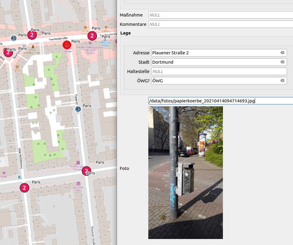 Im neuen Papierkorbkataster der Stadt Dortmund ist es beispielsweise möglich, über QField mit dem mobilen Endgerät Fotos aufzunehmen. Die Bilder werden direkt mit dem Server synchronisiert und in der Datenbank verlinkt, so dass sie direkt nach der Aufnahme auch den Anwendenden des Desktop-GIS zur Verfügung stehen. Im Folgenden ein Beispiel aus dem Papierkorbkataster: