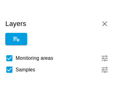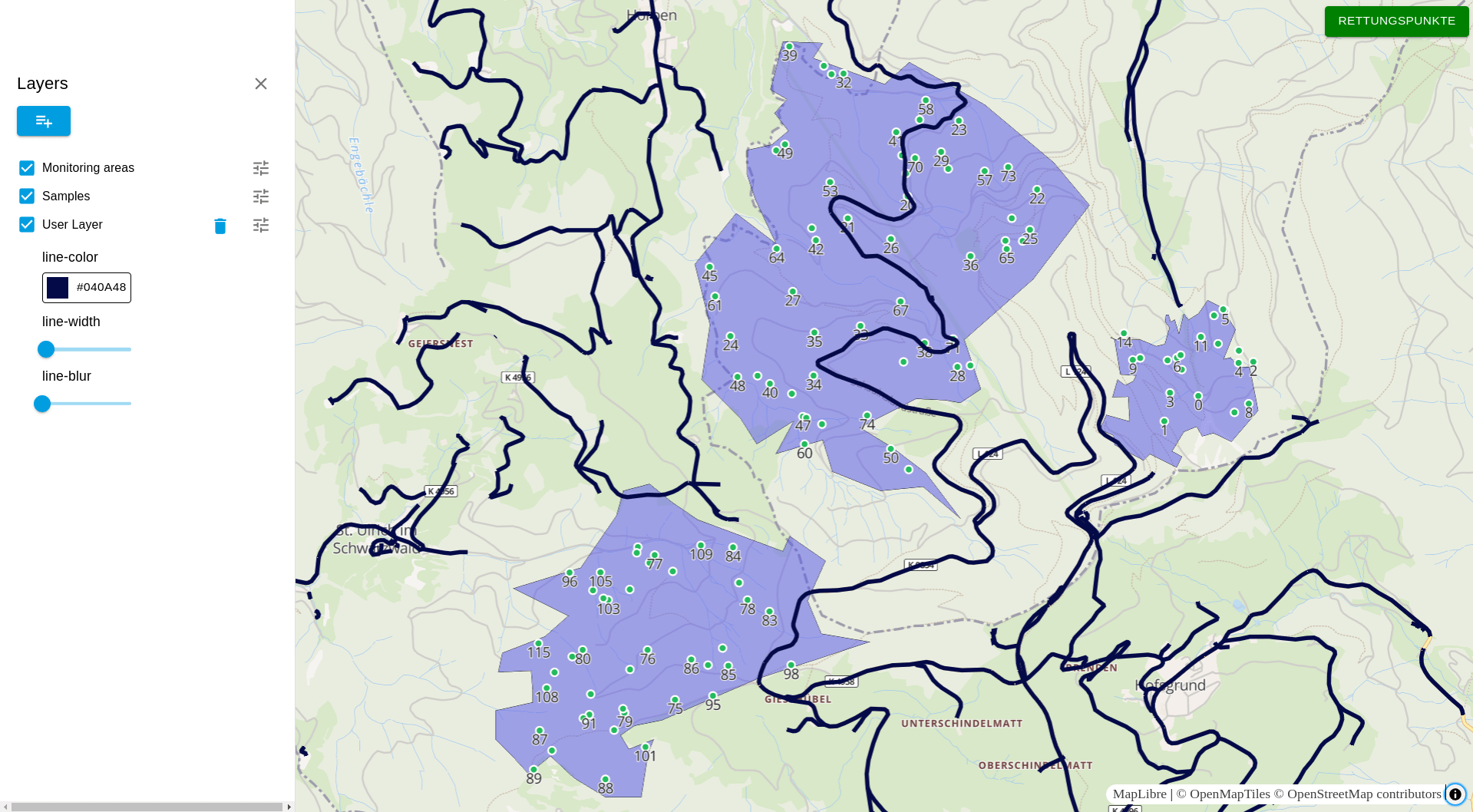 Die Anwendung verfügt über zwei Datenlayer (eine polygonale mit Monitoringbereichen und eine zweite mit Punkten), die verschiedene Proben darstellen.