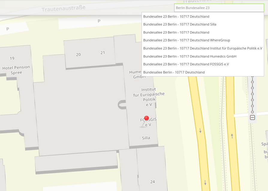 Sollte ein Treffer dabei über einen Parameter nicht verfügen, wird dieser im Ergebnis nicht ausgegeben. Liegt beispielsweise bei der vorliegenden Konfiguration keine Angabe der Postleitzahl (postcode) vor, entfällt diese in der Ausgabe. So kann auf diverse Parameter verwiesen werden, ohne dass diese immer gefüllt sein müssen.