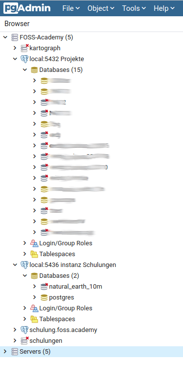 Im Ergebnis habe ich nun nicht nur in pgAdmin einen weiteren Datenbankserver (im Screenshot der local:5436 instanz Schulungen), die Instanzen sind auch auf der Festplatte komplett voneinander getrennt und können unabhängig voneinander konfiguriert werden. Den Baum local:5432 Projekte kann ich nun bei Schulungen und Workshops einfach zugeklappt lassen.