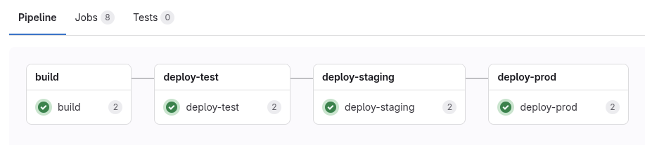 Nach diesem Muster werden auch die Deployments für Staging und Produktion sowie deren Hotfix-Varianten definiert. Dadurch können alle Deployments für die jeweiligen Services und Umgebungen konsistent und nachvollziehbar ausgeführt werden. Die Deploy-Jobs für den Entwicklungsserver werden automatisch getriggert und die Jobs für Staging und Produktiv werden manuell gestartet.