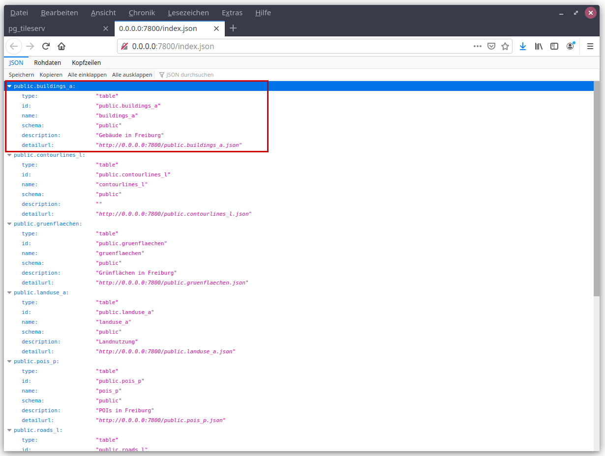 Mit dem Aufruf der index.json (http://0.0.0.0:7800/index.json) wird eine Übersicht der zur Verfügung stehenden Themen ausgegeben (VectorTile-Layer-Schemata). Diese richten sich nach den Tabellen/Sichten mit Geodaten, für die dem Datenbankbenutzer eine Leseberechtigung vorliegt.
