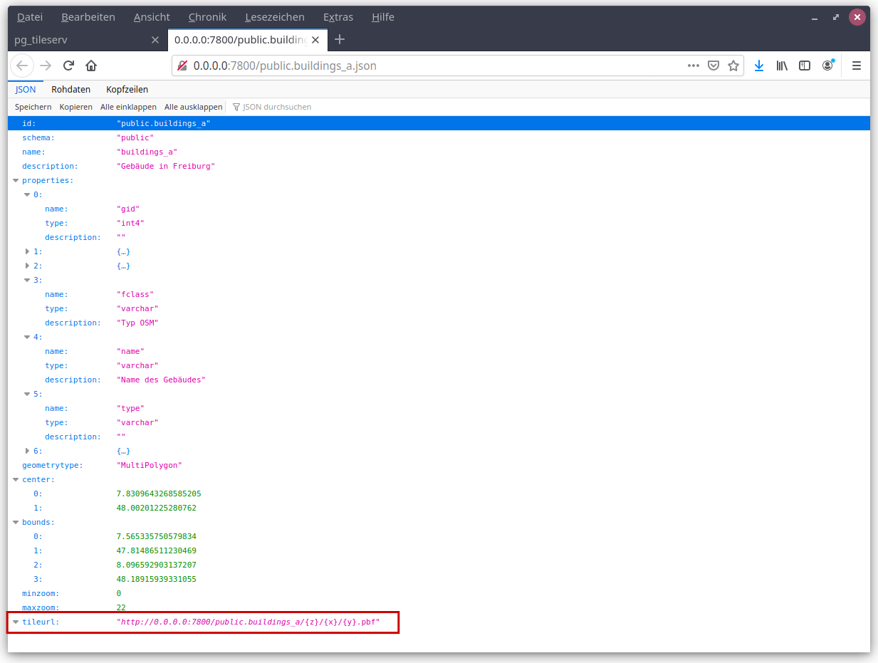 Zu jedem in der Ansicht angezeigten Thema gibt es eine Detail-URL (z. B. "detailurl": 0.0.0.0/public.buildings_a.json), über die der Client Informationen zum Tile-Layer erhält. Enthalten sind Informationen wie id, Beschreibung, Geometrietyp, BoundingBox, Zoomstufen und Attributspalten. Die id setzt sich dabei aus dem Datenbankschema und dem Tabellennamen (z. B. public.buildings_a) zusammen. Als wichtigste Information ist hier die Tile-URL referenziert. Diese kann in Clients wie z. B. QGIS verwendet werden, um das Thema einzubinden.