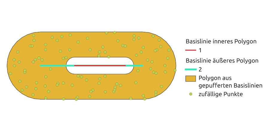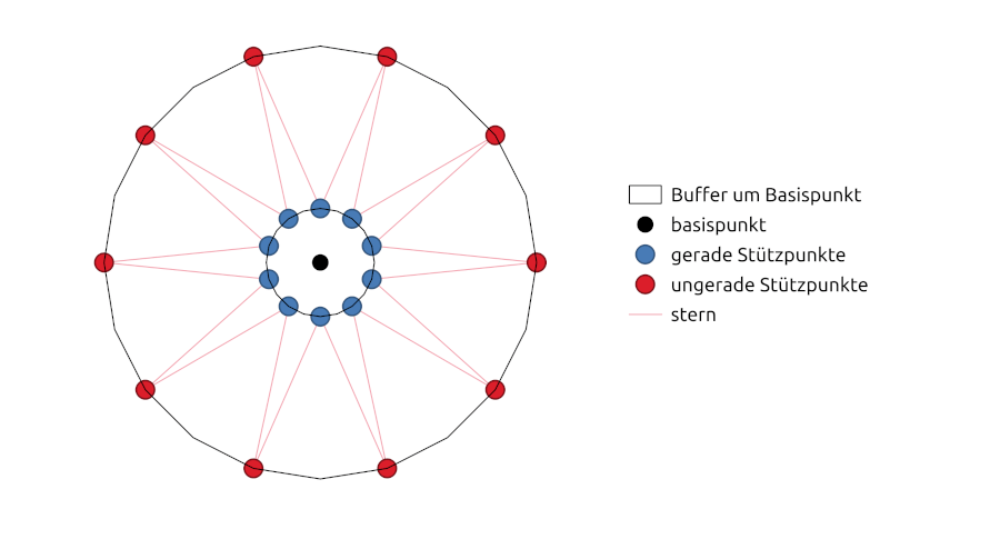 Der Kreis wird mit ST_Buffer aus einem Punkt generiert (wo diese Punkte herkommen, wird am Schluss des Beitrags erläutert). Für das Versetzen der Stützpunkte könnte man nun mit Winkelberechnungen und einem echten Verschieben der Punkte arbeiten, einfacher ist es aber einen zweiten Buffer mit größerem Radius zu bilden und vom ersten Kreis die geraden und vom zweiten Kreis die ungeraden Stützpunkte zu nehmen und diese dann wieder mit ST_Makeline zu verbinden.