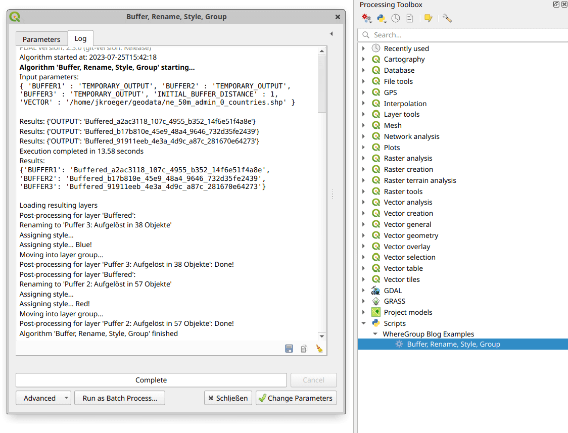 Mit dem erstellten Code (zusätzlich zum eigentlichen Verarbeitungsalgorithmus) wird QGIS nach der Beendigung des Algorithmus ein Postprocessing durchführen und in diesem Fall zwei Layer dynamisch umbenennen, gruppieren und je nach Datenlage mit einem bestimmten Stil versehen. Das mag auf den ersten Blick kompliziert erscheinen, ist aber je nach Anwendungsfall mit wenigen Zeilen Extracode implementiert und erleichtert die Arbeit mit dem Werkzeug anschließend ungemein.