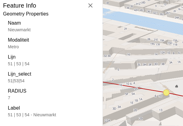 Auf dieser Zoomstufe werden Hintergrundkarte und Geometrien als Vectortiles in zwei getrennten pmtiles-Dateien bereitgestellt. Unten rechts können wir über das Navigationstool in die 3D-Ansicht wechseln.
