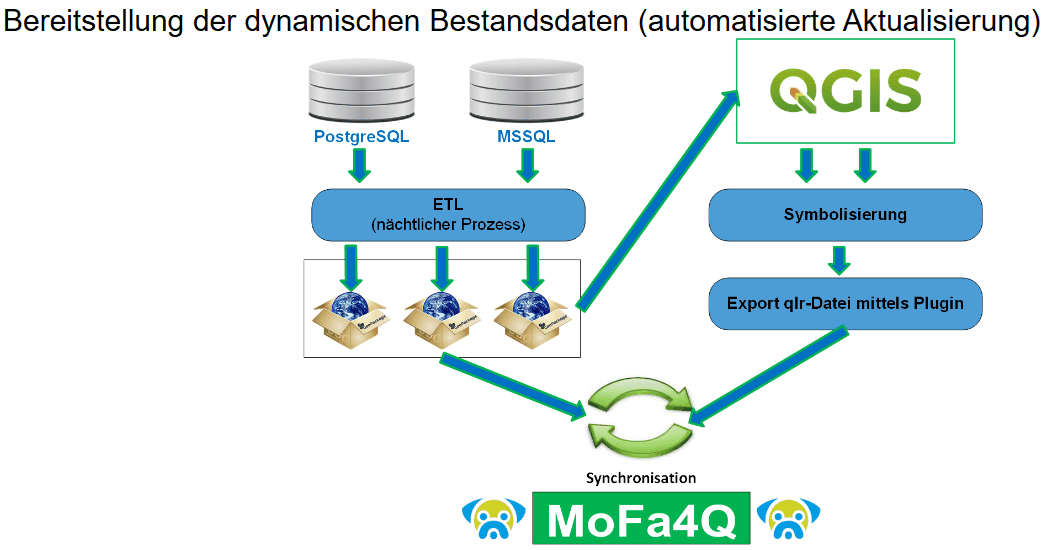 Nun steht uns mit MoFa4Q eine Anwendung zur Verfügung, mit der die Daten jede Nacht völlig automatisiert in Geopackages (für die verschiedenen Sparten) auf unserem eigenen Server erzeugt und bereitgestellt werden. Damit stehen täglich aktuelle Daten zur Synchronisierung Verfügung.