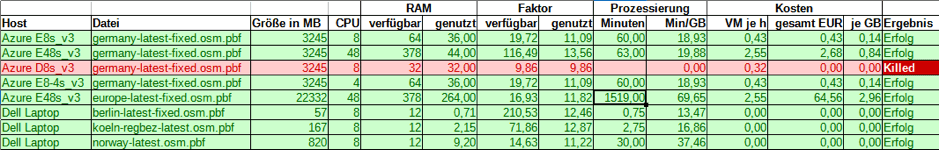 Die ersten Versuche mit dem deutschen OpenStreetMap-Datenbestand (germany-latest.osm.pbf mit 3,2 GB) auf den kleineren VMs scheitern dann aber schnell: Der sparsam vergebene Arbeitsspeicher veranlasst die Systeme schnell zur Nutzung der Auslagerungsdatei (Swap); in so einem Fall ließ sich auch nach mehreren Stunden Prozessierung niemals ein Erfolg erzielen.