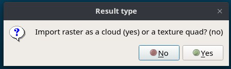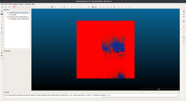 Öffnen Sie nun CloudCompare. Die PointCloud sowie die TIFF-Datei werden, wie oben beschrieben, importiert (Hinweis: Da die TIFF-Datei als eine Cloud importiert werden soll, klicken Sie hier bitte yes).