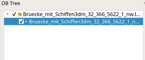 Um eine PointCloud zuzuschneiden, muss diese zunächst im sogenannten DB-Tree ausgewählt werden. Um das zu tun, klicken Sie in der PointCloud auf die 3D-Darstellung oder den DB-Tree. Wenn die PointCloud ausgewählt ist, wird ein gelber Kasten um die PointCloud angezeigt und ist im DB-Tree blau markiert.