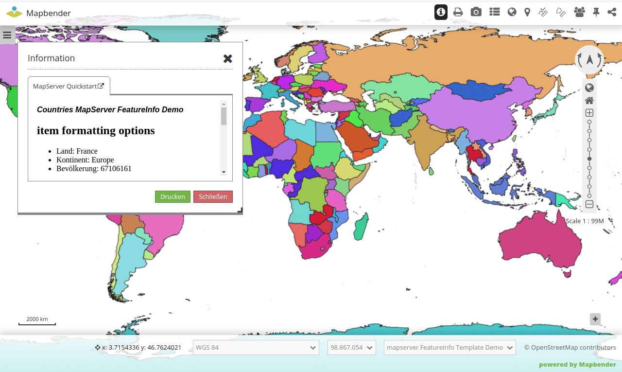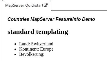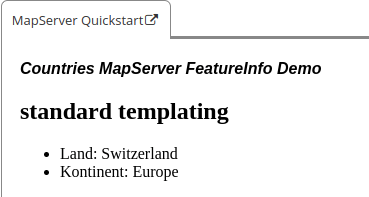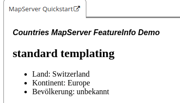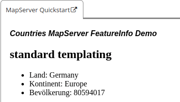 MapServer zeigt uns an, welche Werte die Spalten admin, continent und pop_est für die angeklickte Fläche haben. Wenn einer der Werte nicht gesetzt ist, gibt es einen leeren Eintrag.