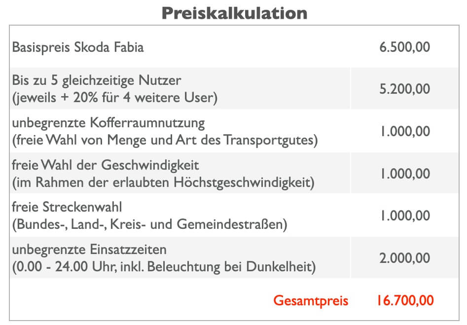 Der Basispreis von 6.500 Euro war natürlich verlockend. Allerdings sahen wir uns doch gezwungen, einige Pakete hinzuzubuchen, um meiner Frau eine vollumfängliche Nutzung des Autos zu gewährleisten. Für einen nicht mehr so attraktiven Gesamtpreis von 16.700 Euro erweiterten wir die Nutzungsbedingungen mit einigen Optionen zur unbegrenzten Verwendung im Rahmen der Vorgaben der Straßenverkehrsordnung. Die Preisstaffelung ist Tabelle 1 zu entnehmen.