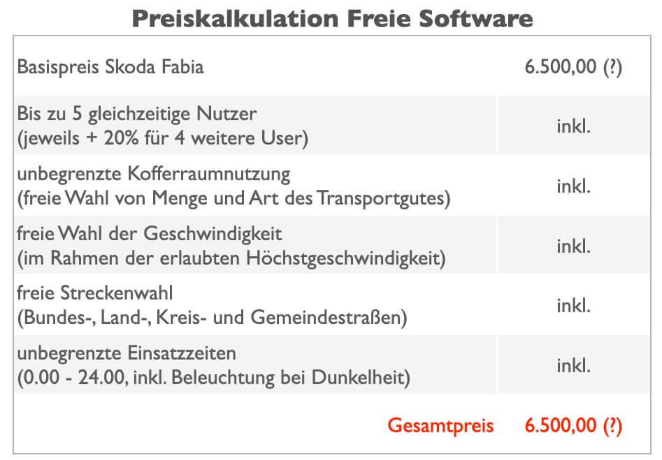 Vielleicht haben sich aufmerksame Leserinnen und Leser schon gefragt, was die Fragezeichen in der Tabelle bedeuten und warum das Auto überhaupt etwas kostet, wo es doch frei ist. An dieser Stelle sei auf den Unterschied zwischen kostenfreier, lizenzkostenfreier und freier Software hingewiesen, drei Begriffe, die oft miteinander verwechselt werden.